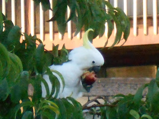 It is that time of year when we have an abundance of fruit on our trees just waiting to ripen. Now, I don't mind sharing with the wildlife but the cockatoos are quite greedy and have a habit of getting to the fruit before it ripens. They leave such a mess too! A few mornings they arrive for breakfast and wake me up with the sound of fruit rolling down our roof and plopping onto the paving. They return each evening for dinner as well! I must admit they do make me laugh sometimes peering down to look at me from the roof or having a frozen moment with a nectarine in their claws about to take a bite when I interrupt them. My neighbours must be wondering why they have half eaten nectarines on their paths and in their gutters because when I shoo them away they fly to the roof tops of surrounding houses and continue eating. A progressive dinner?